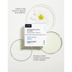 L'efficacité du shampoing solide soin d'hiver repose sur une alliance d'ingrédients rigoureusement sélectionnés. Il contient de l'extrait d'Edelweiss bio, récolté à Névache dans les Hautes-Alpes. Cette fleur rare nourrit intensément le cheveu et le protège de l'oxydation. La formule intègre également des protéines végétales de blé, une alternative végétale efficace à la kératine animale. Ces protéines viennent combler les brèches et reconstruire la fibre capillaire en profondeur. Ce soin prévient ainsi la déshydratation et redonne du volume aux cheveux, même lorsqu'ils sont aplatis par le port régulier de bonnets.